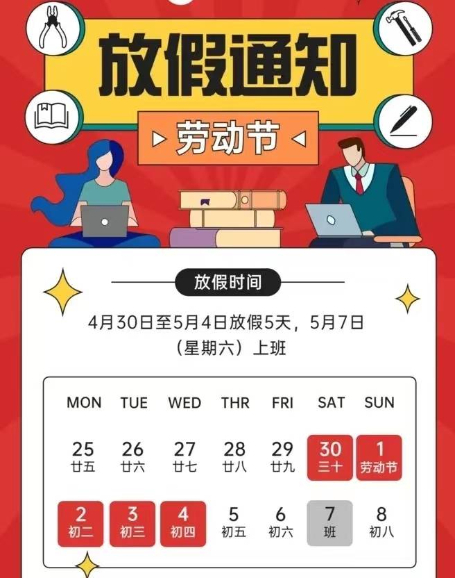 时间过得 真快,不知道不觉又到了五一节,想想就高兴,又可以休息5天啦!提前把公司的放假安排发出来,共享: